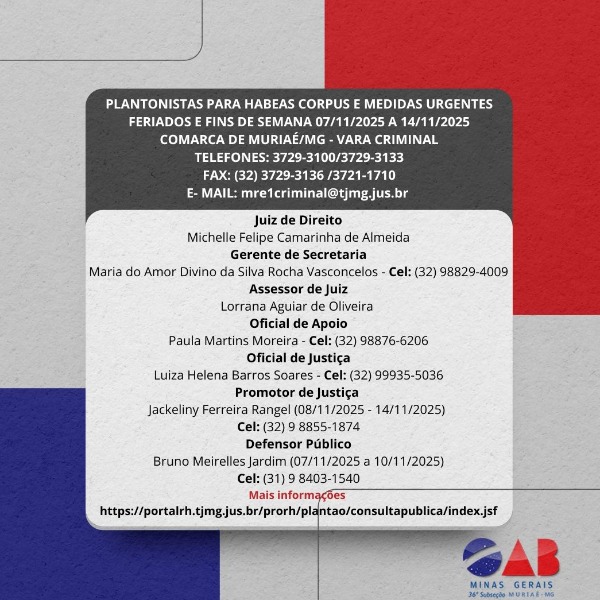 PLANTONISTAS PARA HABEAS CORPUS E MEDIDAS URGENTES FERIADOS E FINS DE SEMANA 07/11/2025 A 14/11/2025