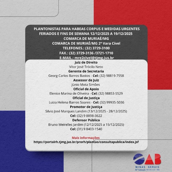 PLANTONISTAS PARA HABEAS CORPUS E MEDIDAS URGENTES FERIADOS E FINS DE SEMANA 12/12/2025 A 19/12/2025