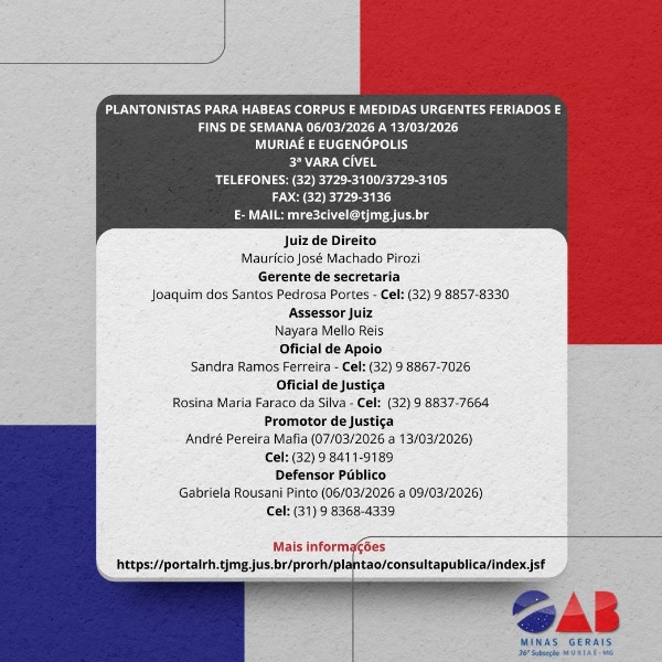 PLANTONISTAS PARA HABEAS CORPUS E MEDIDAS URGENTES FERIADOS E FINS DE SEMANA 06/03/2026 A 13/03/2026